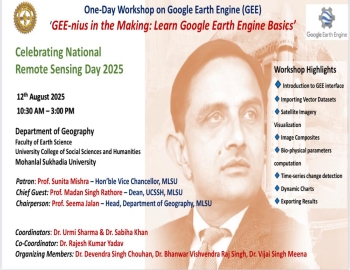 The Department of Geography, MLSU, successfully organized a one-day workshop “GEE-nius in the Making: Learn Google Earth Engine Basics” on 12th August 2025 to celebrate National Remote Sensing Day 2025, marking the 106th birth anniversary of Dr. Vikram Sarabhai, the father of India’s space program. This was the first time our department celebrated this day, making it a special milestone. The event began with a pre-workshop session attended by faculty members, postgraduate students, and research scholars of the department where they were introduced the objectives and significance of the day. The workshop focused on the scope of Google Earth Engine (GEE) in geospatial analysis and the integration of AI tools to enhance analytical capabilities for non-programmers.